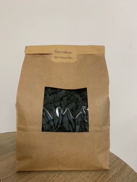 Pâtes sèches sans œufs, uniquement eau, semoule de blé dur extra fine et 3% de spiruline de Brocéliande en poudre.